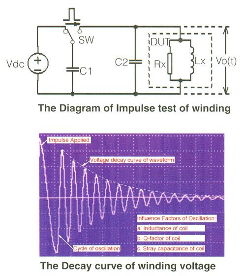■ 脉冲式线圈测试仪需在不损坏被测件的条件下测试其电气性能,首要条件是能在短暂的瞬间判别线圈的品质。测量时将与标准线圈测量时同样的脉冲通过电容器放电施加于被测线圈,由于线圈电感量和Q值的存在,将响应一个对应于该放电脉冲的电压衰减波形,比较该衰减波形的某些特征,可以检测线圈匝间和层间短路及圈数和磁性材料的差异,如果施加一个高电压脉冲,可根据出现的电晕或层间放电来判断绝缘不良。