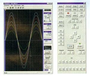 这个屏幕显示的是计算机上实时显示的8841测量期间的屏幕,屏幕左边是波形显示,右边是控制盘。在实时显示测量波形的同时,也可以象使用存储记录仪上的按键一样,使用屏幕上显示的控制盘按键.