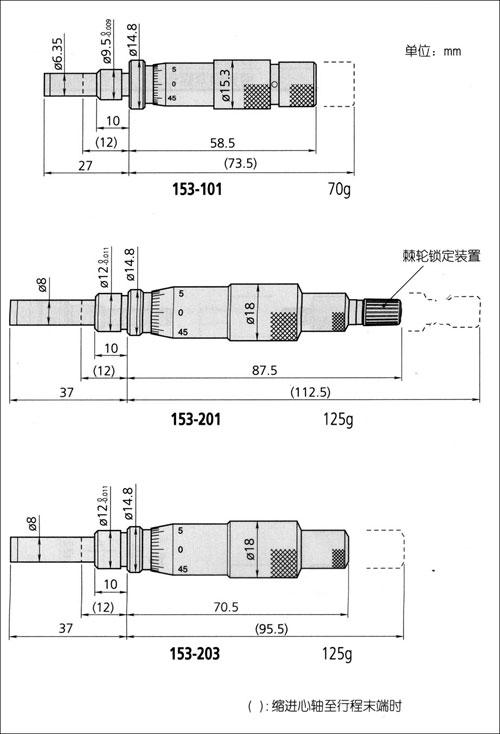 | 15mm | 153-101 | .5" | 153-108 | 普通型 | 平面(硬质合金头) | 带有游标(.0001") |
