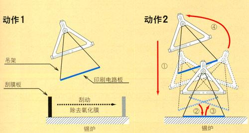 ①安装在吊架上的印刷电路板降至焊锡面。