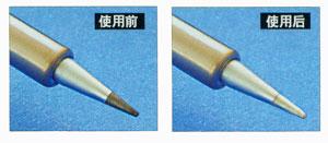 焊嘴再生研磨剂残留于焊嘴进行焊锡时,研磨剂附着于印刷电路板,有可能对电路板产生侵蚀破坏。请完全清除焊嘴上的研磨剂后,再进行焊锡作业。