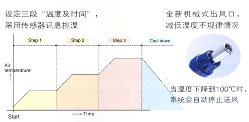 ●加热状态可因应温度传感器讯息而作出改变,可设定三段加热程序,提供灵活方便的温度、风量及时间控制,让需要高度精密的作业标准化。